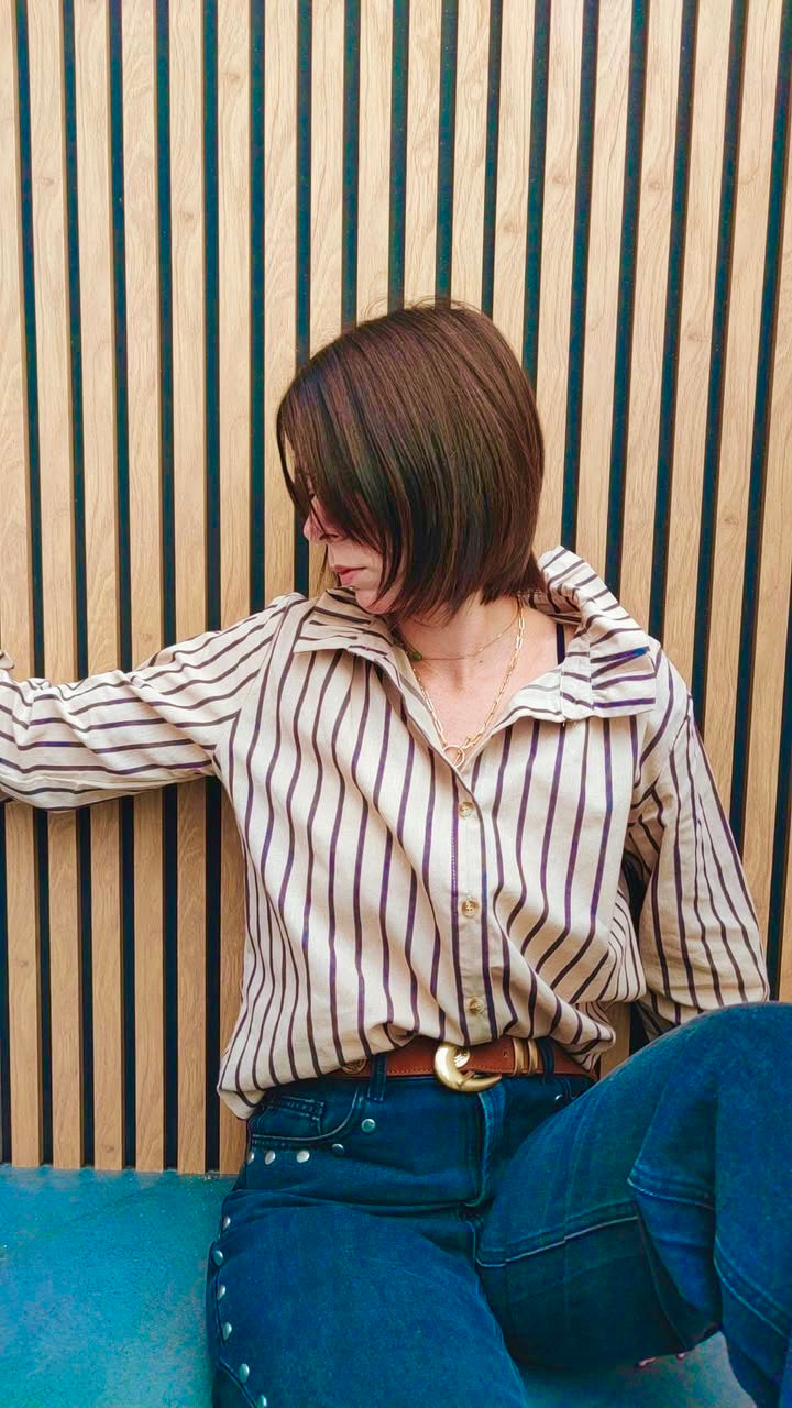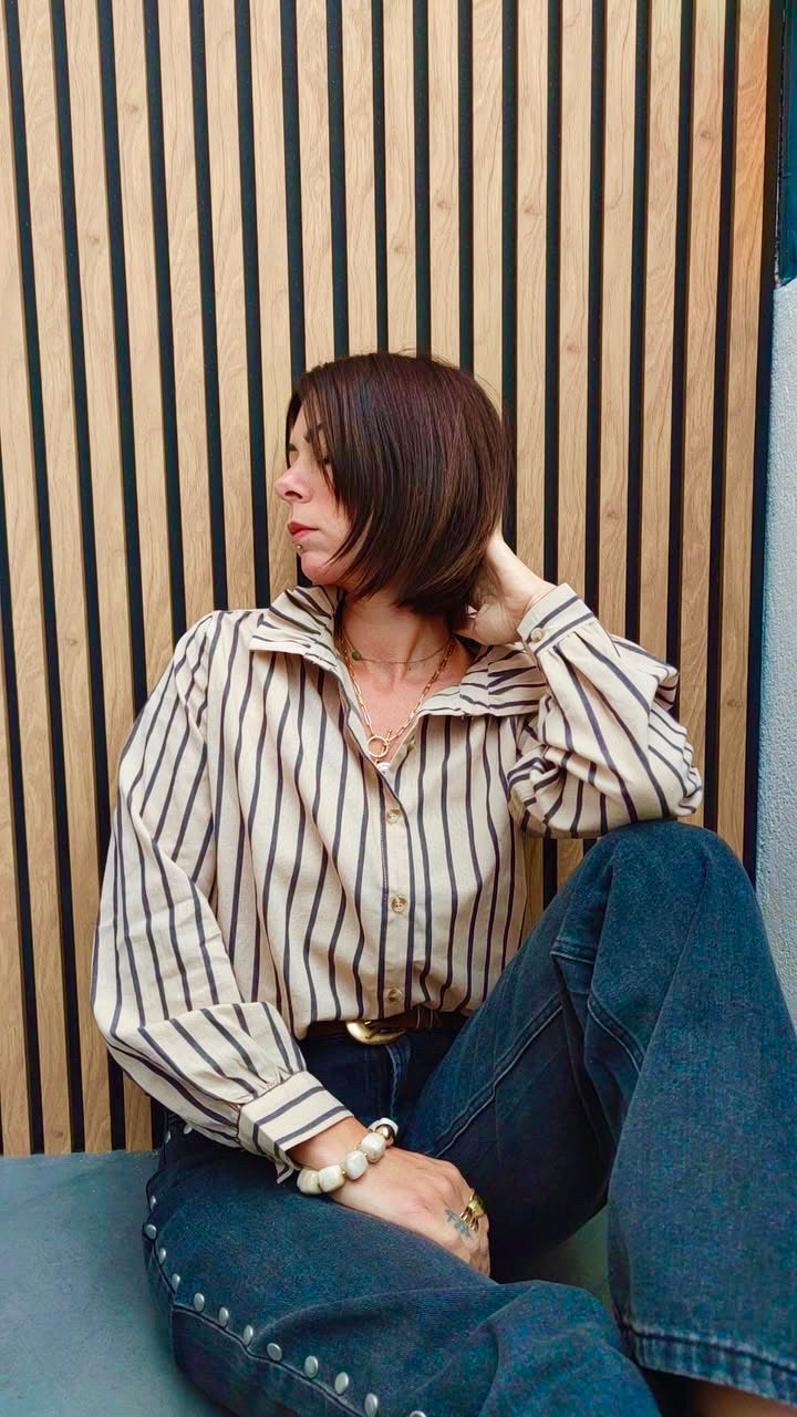 Coup de coeur pour son col montant au design original et sa teinte sable rehaussée de fines rayures anthracite qui en font une pièce facile à associer, que ce soit avec un pantalon habillé ou un jean casual.