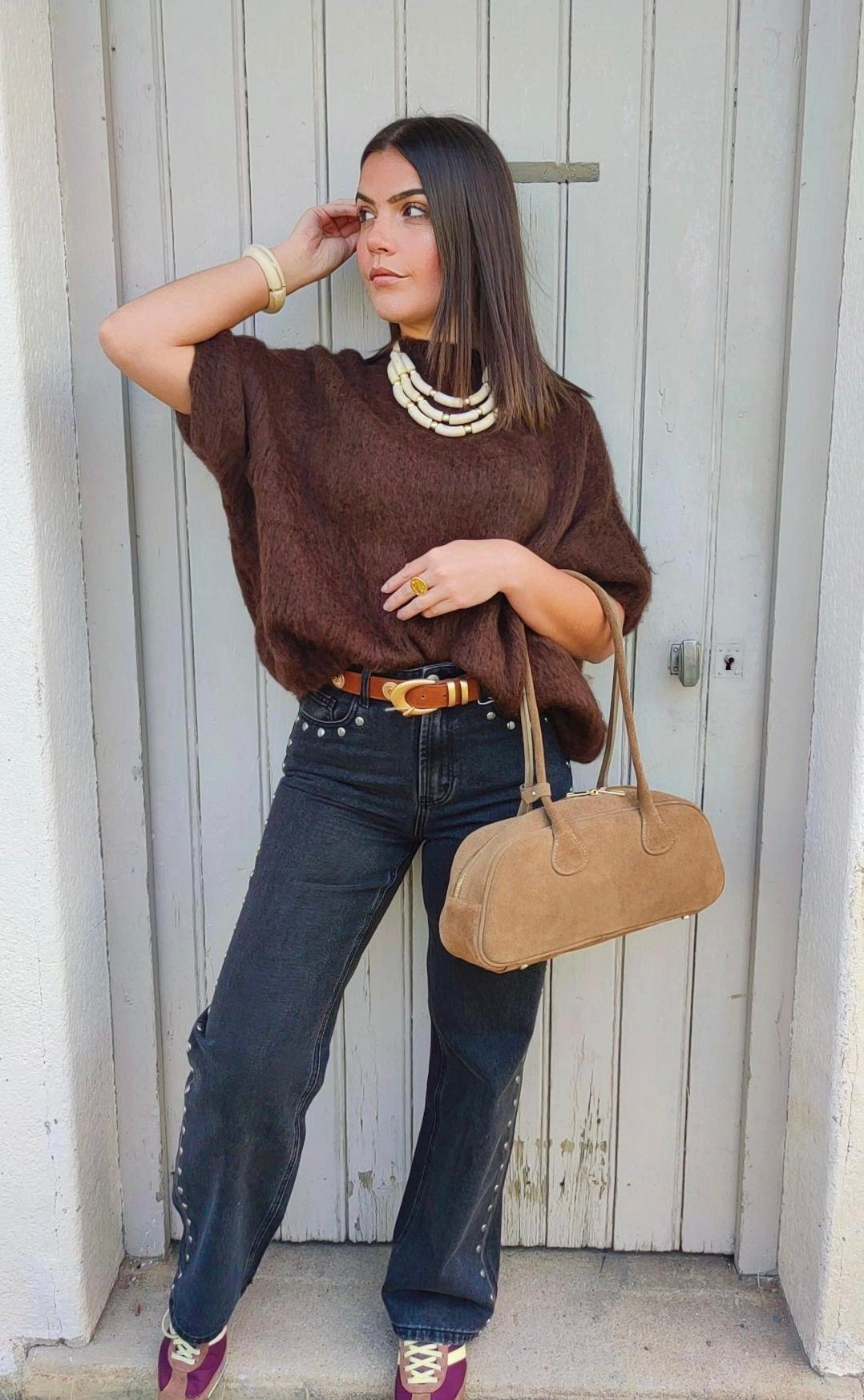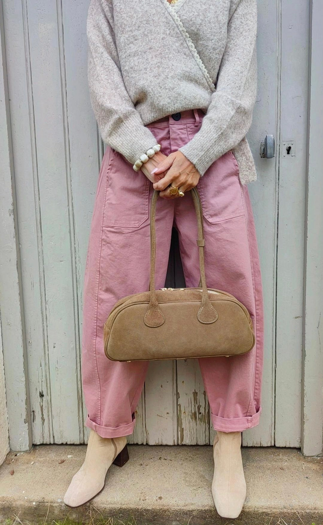 Apportez une touche de douceur et d’élĂ©gance Ă votre tenue avec ce sac en daim taupe.Â